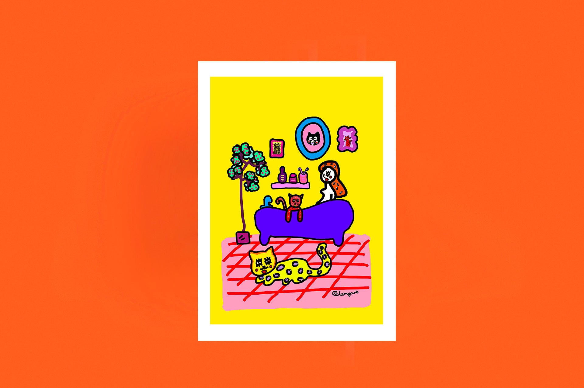 Découvrez l'affiche pop art colorée "La salle de bain" imaginée par l'artiste Clemyart. Cette création originale met en scène deux chats espièges dans un moment de détente : l'un confortablement allongé sur un tapis moelleux, tandis que l'autre tente une escalade amusante vers la baignoire où se prélasse sa maîtresse.